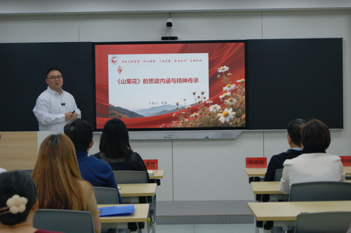 陈慷教师围绕《山菊花》一书,生动讲述了于震海、桃子等革命者在抗日战争中坚韧不拔、宁折不屈的英雄事迹。通过对山菊花顽强生命力的描写,引申出深刻的人生启示:面对困难与挑战,应如风雨中的山菊花,在磨砺中成长,于荆棘间绽放,始终保持积极向上、昂扬奋进的精神姿态。
